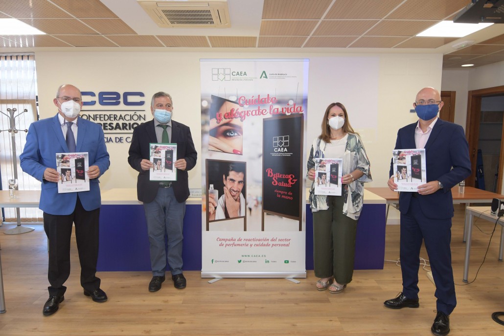 La sede de la Confederación de Empresarios de la Provincia de Cádiz (CEC) ha acogido en la mañana de hoy el acto de presentación de la campaña de reactivación del sector de perfumería, cosmética y cuidado personal “Cuídate y alégrate la vida. Belleza y salud siempre de la mano”, que está impulsando la Confederación Andaluza de Empresarios de Alimentación y Perfumería (CAEA), en colaboración con la Consejería de Transformación Económica, Industria, Conocimiento y Universidades de la Junta de Andalucía.