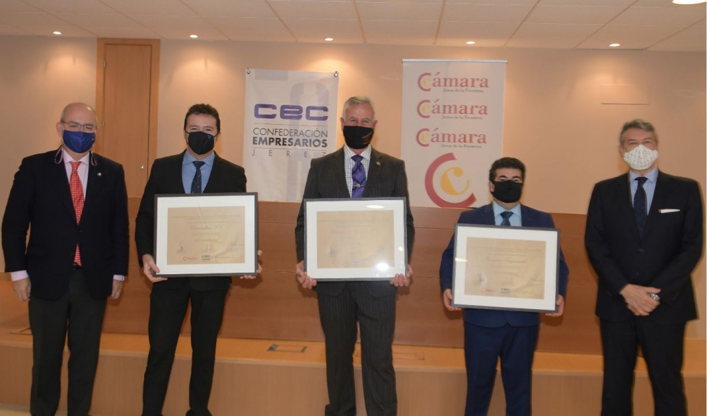 Javier Sánchez Rojas, presidente de la CEC y la Cámara jerezana, y César Saldaña, presidente del Consejo Regulador del Jerez han entregado diplomas de reconocimiento a la extraordinaria labor que desarrollan Jesús Rubiales de Venenciadores SL, Jesús Delgado de Venencia & Imagen SL y Jesús Tocino, de Venencias Torquemada, como fabricantes de venencias más antiguos de Jerez.