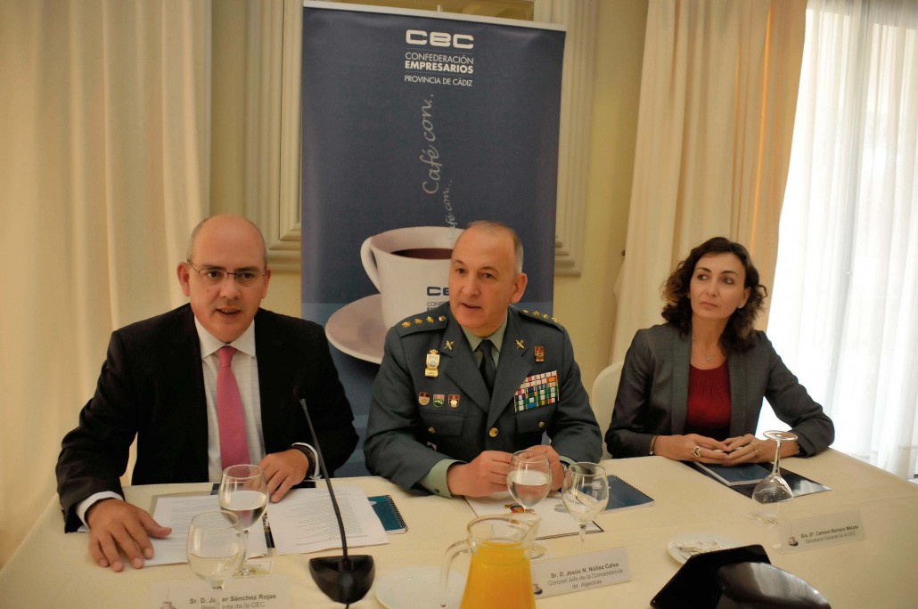 El coronel Jesús Núñez, jefe de la Comandancia de la Guardia Civil en Algeciras y responsable de la demarcación del Campo de Gibraltar, ha intervenido hoy en el ciclo “Café con…” que la Confederación de Empresarios de la provincia de Cádiz viene celebrando en la comarca, con el objetivo de poner en contacto a empresarios, directivos y profesionales, con personalidades relevantes de la política, las instituciones y la sociedad campogibraltareña en general.