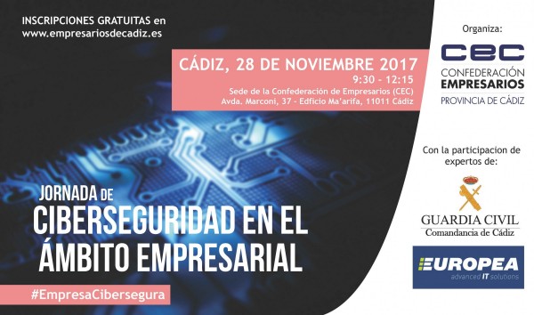 La Confederación de Empresarios de la provincia de Cádiz, la Comandancia de la Guardia Civil de Cádiz y la empresa Europea IT (Europea Group) organizan esta jornada con el objetivo de difundir y promover las acciones preventivas de protección de las cadenas de valor de las empresas, frente a posibles ataques informáticos.