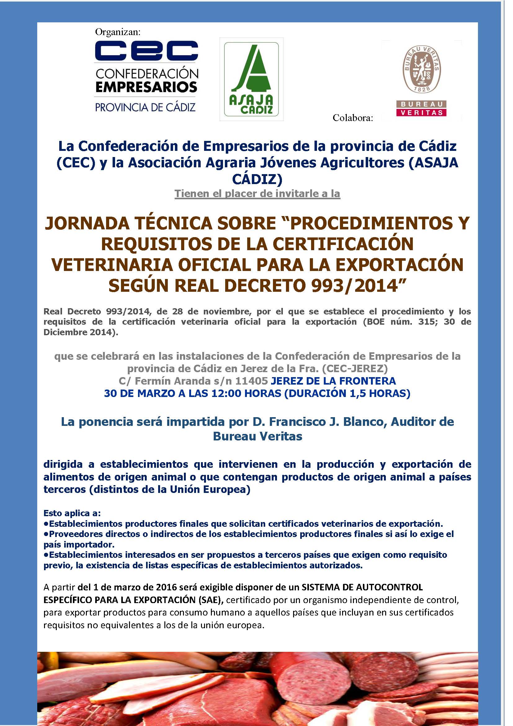 La Confederación de Empresarios de la provincia de Cádiz (CEC) y la Asociación Agraria Jóvenes Agricultores (ASAJA CÁDIZ) organizan, en colaboración con Bureau Veritas, la Jornada técnica sobre “PROCEDIMIENTOS Y REQUISITOS DE LA CERTIFICACIÓN VETERINARIA OFICIAL PARA LA EXPORTACIÓN SEGÚN REAL DECRETO 993/2014”.