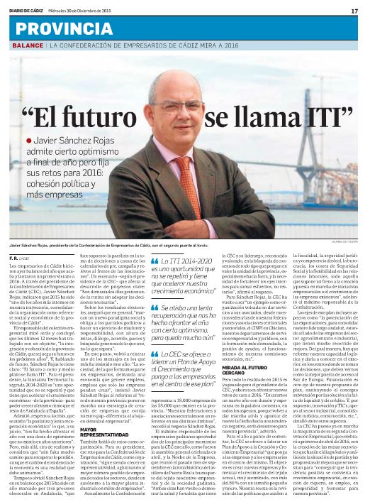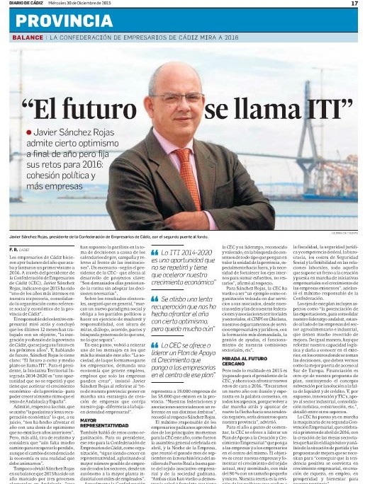 El presidente de la Confederación de Empresarios de la provincia de Cádiz (CEC), Javier Sánchez Rojas, ha asegurado que el año 2015, que está a punto de terminar, “ha sido uno de los más intensos en nuestra trayectoria, consolidando la organización como referente social y económico de la provincia de Cádiz”. Sánchez Rojas ha hecho balance de estos últimos 12 meses señalando que la CEC ha trabajado en el objetivo que se han marcado los empresarios: “la integración y cohesión de la provincia de Cádiz, que se juega su futuro en los próximos años”.