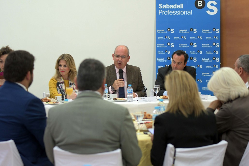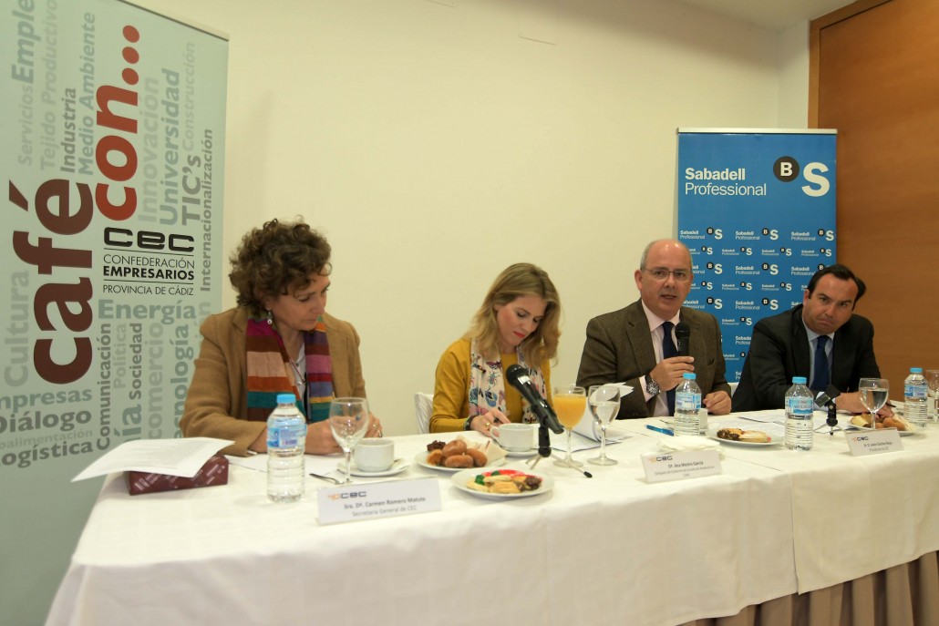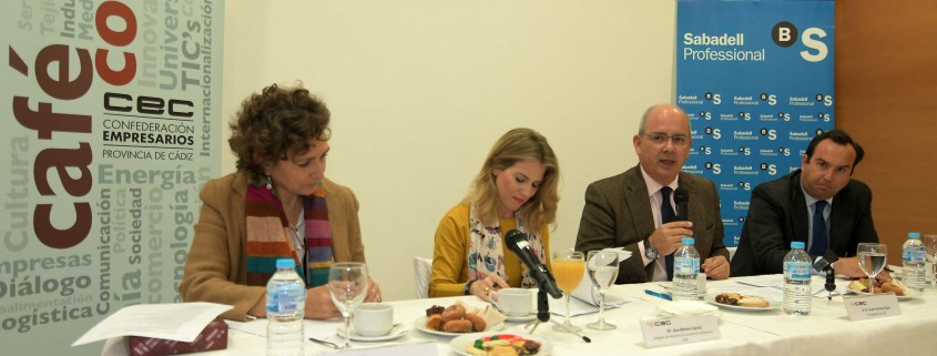 La delegada del Gobierno de la Junta de Andalucía en Cádiz, Ana Mestre, ha participado esta mañana en un nuevo encuentro del ciclo “Café con”, organizada en nuestra sede de Cádiz y patrocinada por Banco Sabadell, que ha estado representado por Abrahám Camacho, director de la Oficina Principal en Cádiz.