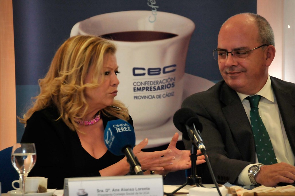 La presidenta del Consejo Social de la UCA, Ana Alonso Lorente, ha intervenido esta mañana en el ciclo “Café con…”, que organiza la Confederación de Empresarios de la provincia de Cádiz (CEC).