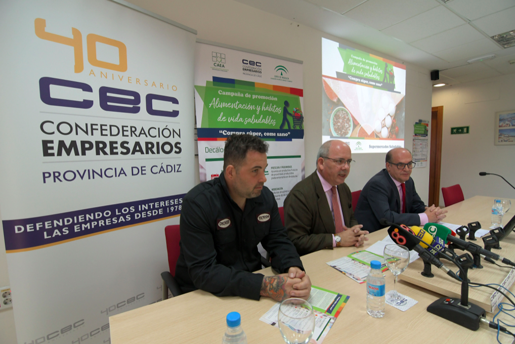 La sede de la Confederación de Empresarios de la Provincia de Cádiz (CEC) ha acogido en la mañana de hoy el acto de presentación de la Campaña de promoción de la alimentación y los hábitos de vida saludable, “Compra súper, como sano”, que está impulsando la Confederación Andaluza de Empresarios de Alimentación y Perfumería (CAEA), en colaboración con la Junta de Andalucía. El acto contó con la participación del presidente de la CEC, Javier Sánchez Rojas, el representante de CAEA, Antonio Colsa y el reconocido chef Mauro Barreiro de “La curiosidad de Mauro”.