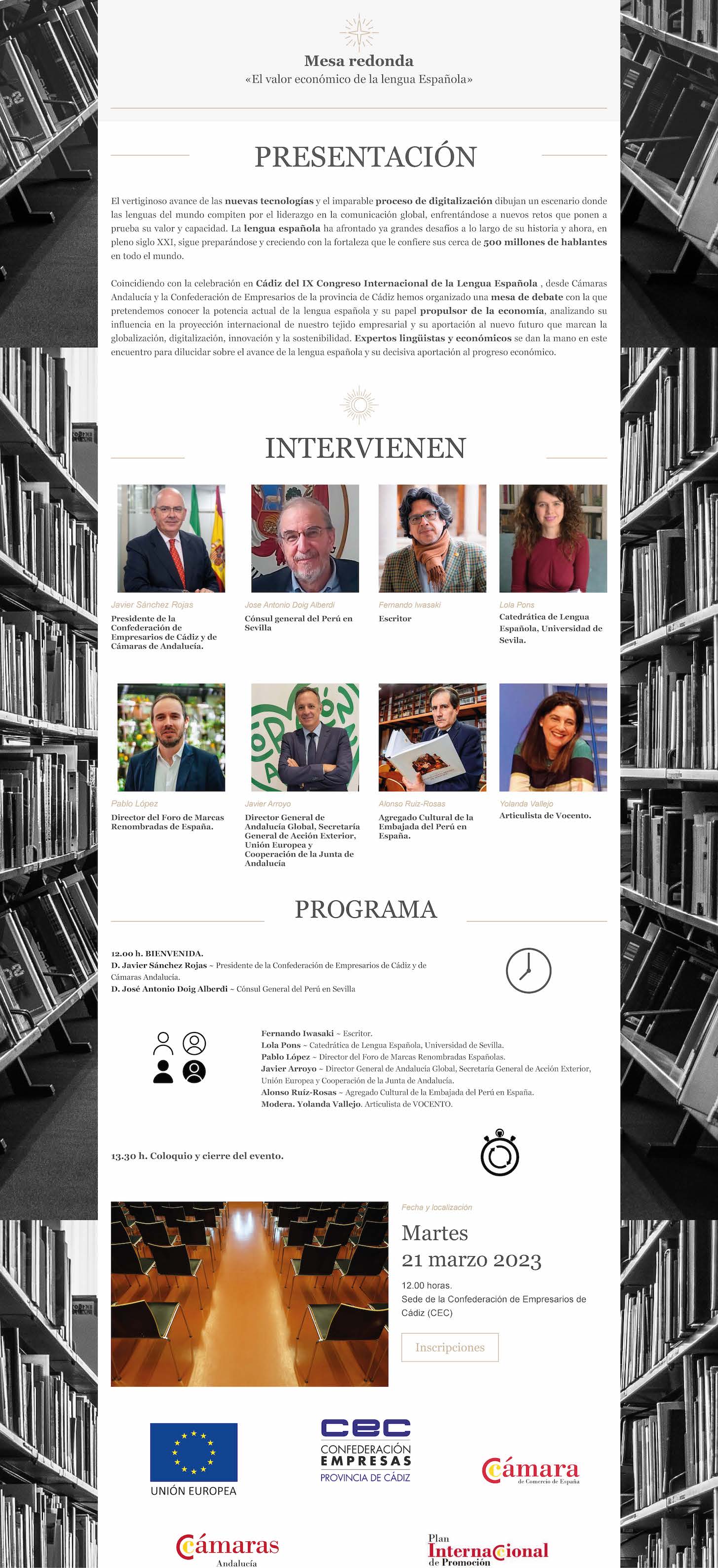 Mesa redonda. “El valor económico de la lengua Española” 16 de marzo de 2023 / en Noticias/por Empresarios de Cádiz Click en la imagen para inscripción. Leer más →