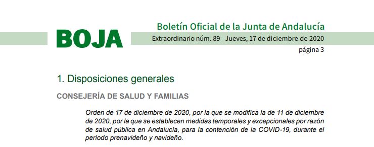 Orden de 11 de diciembre de 2020, por la que se establecen medidas temporales y excepcionales por razón de salud pública en Andalucía, para la contención de la COV-19, durante el periodo prenavideño y navideño.
