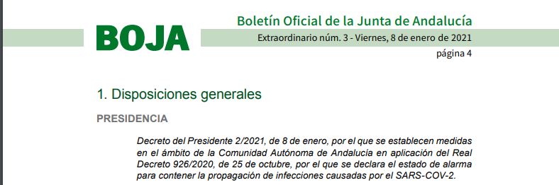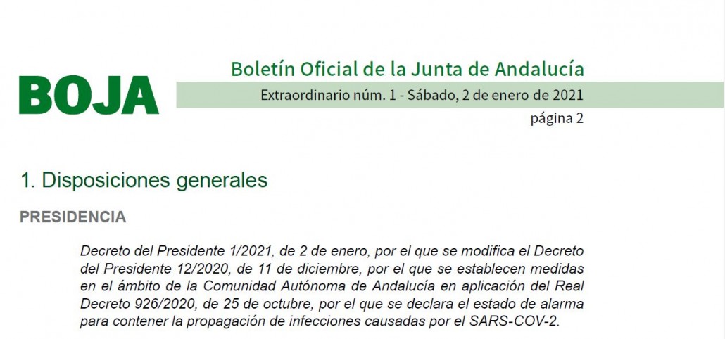 Decreto del Presidente 12/2020, de 11 de diciembre, por el que se establecen medidas en el ámbito de la Comunidad Autónoma de Andalucía en aplicación del Real Decreto 926/2020, de 25 de octubre, por el que se declara el estado de alarma para contener la propagación de infecciones causadas por el SARS-COV-2.
