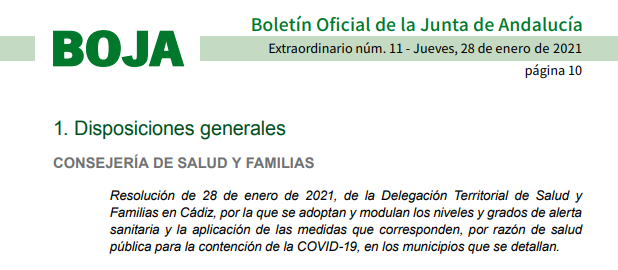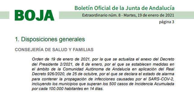 Orden del 19/01/2021, y Resolucion de 18/01/2021, sobre la información perimetral de la provincia así como el cambio en la localidad de Los Barrios que pasa a nivel 4 grado 2.