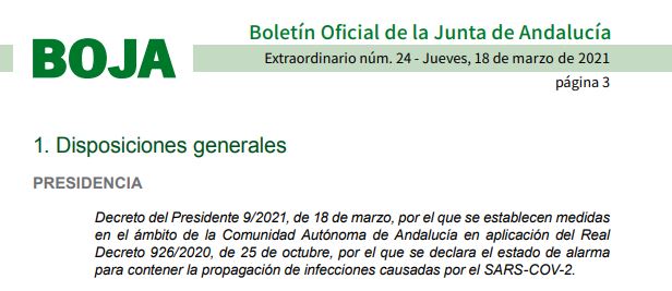 Decreto del Presidente 7/2021, de 25 de febrero, por el que se prorrogan las medidas establecidas en el Decreto 2/2021, de 8 de enero, por el que se establecen medidas en el ámbito de la Comunidad Autónoma de Andalucía en aplicación del Real Decreto 926/2020, de 25 de octubre, por el que se declara el estado de alarma para contener la propagación de infecciones causadas por el SARS-COV-2.