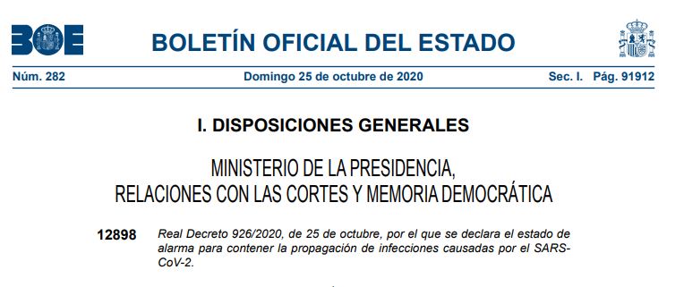 Real Decreto 926/2020, de 25 de octubre, por el que se declara el estado de alarma para contener la propagación de infecciones causadas por el SARSCoV-2